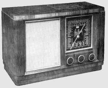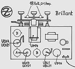 ..........."B r i l l a n t" heißt die Zusammenstellung für einen Großsuper, ebenfalls für zwei Wellenbereiche und sechs Abstimmkreise mit einem Abstimmkreuz (UM 4) in Allstromausführung. Der "L u x u s - B r i l l a n t" ist ein Fünf-Röhren-Super für zwei Wellenbereiche mit je einem Hoch- und einem Tieftonlautsprecher, Niederfrequenzbreitbandverstärkung, zweistufiger Gegenkopplung, gehörrichtiger Lautstärkeregulierung und Klangblende. Entsprechend dem erweiterten Frequenzumfang ist eine 9-kHz-Sperre vorgesehen. Im Eingang ist eine Zwischenfrequenzsperre eingebaut.