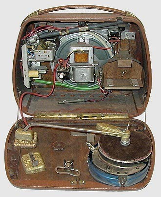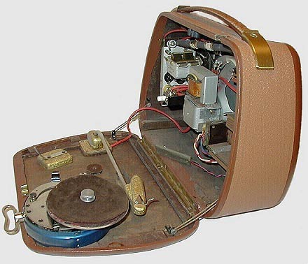 tragbarem Koffer-Radioapparat kombiniert mit einem Laufwerk für die Uebertragung von Schallplatten.
