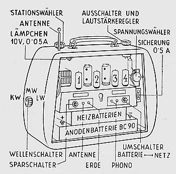Es ist gelungen, durch eine einfache Umschaltung den Netzbetrieb sofort auf Batteriebetrieb umzustellen und so ergibt sich eine Vielfalt an Verwendungsmöglichkeiten. Nicht nur im Heim, sondern auch im stromlosen Gartenhaus, beim Sport wie im Kraftfahrzeug können diese Geräte ohne merkliche Leistungsverminderung mit demselben Erfolg verwendet werden. Durch die Verwendung der zwar etwas schweren 90-V- bzw. 70-V-Anodenbatterien und der dazugehörigen Heizbatterien ist es gelungen, den Preis der Verbrauchstunde für den Batterieempfang auf ca. 75 Groschen herabzusetzen.