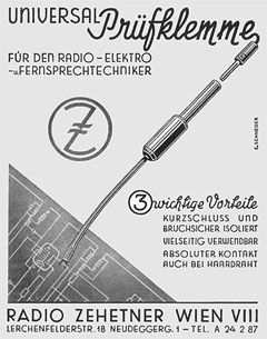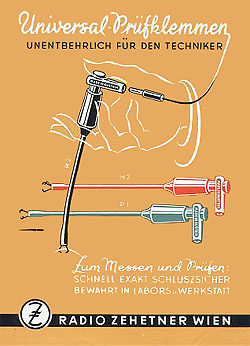 Die ZEHETNER-Universal-Prüfklemmen sind in der gesamten Schwachstromtechnik verwendbar und haben sich besonders bewährt in Labors und Werkstätten der Post- und Telegraphenanstalten, in Radiofabriken und Radioreparaturwerkstätten, sowie überhaupt in allen Sparten der Miniatur-Apparatetechnik. Es handelt sich um vollkommen kurzschlußsichere Klemmen mit einer Greifvorrichtung, die auch haardünne Drähte sicher aufnimmt und besten Kontakt bietet. Sie werden in den Farben rot, schwarz und grün erzeugt. Der Techniker, welcher die Universal-Prüfklemmen einmal gewöhnt ist, kann sie nicht mehr missen. **************************************** |